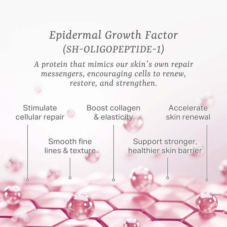 Growth factors are naturally occurring proteins in the body that play a vital role in cell communication, growth, and repair. In skincare, growth factors help stimulate cellular regeneration, promoting the production of collagen and elastin, which are essential for maintaining skin's firmness and elasticity. The EGF Cellular Repair Serum contains EGF to enhance your skin’s natural healing processes, helping to reduce the appearance of fine lines and wrinkles while improving overall skin texture and tone. By supporting the skin’s structural integrity, growth factors contribute to a more youthful, radiant complexion.