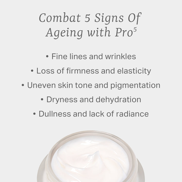 Pro5 Age-Defying Peptide Cream targets the five key signs of ageing: fine lines and wrinkles, loss of firmness and elasticity, uneven skin tone and pigmentation, dryness and dehydration, and dullness. With powerful hexapeptides to relax expression lines, our patented collagen technology restores firmness, while active ingredients deeply hydrate and brighten, helping your skin look smoother, firmer, and more radiant over time.