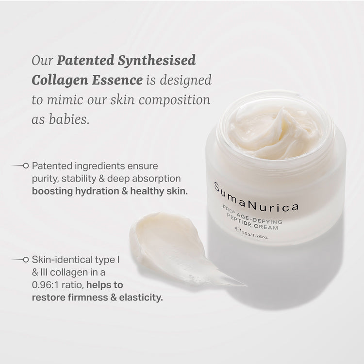 Pro5 Age-Defying Peptide Cream is formulated with many advanced active ingredients, including Acetyl Hexapeptide-8 and our Patented Synthesised Collagen Essence, which work together to stimulate collagen production, restore firmness, and smooth out fine lines and wrinkles. It’s designed to promote a youthful, radiant complexion.